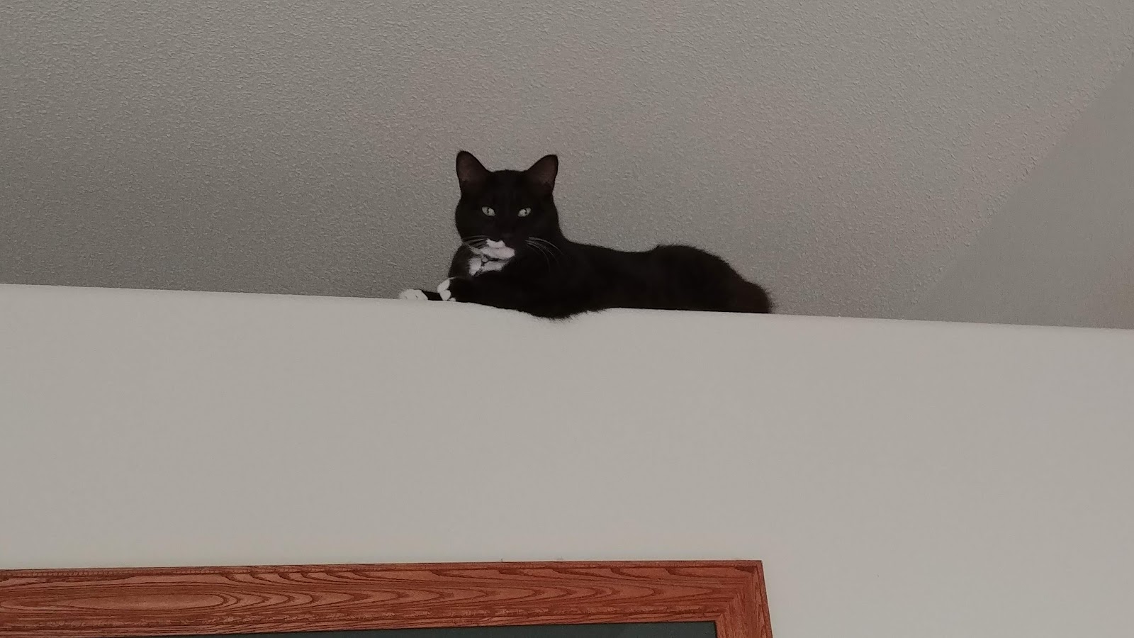 | Before Jack started doing it, Dargo was the cabinet walker and still is. But Dargo doesn't jump straight up. He takes the "steps": counter to fridge to cabinets. |